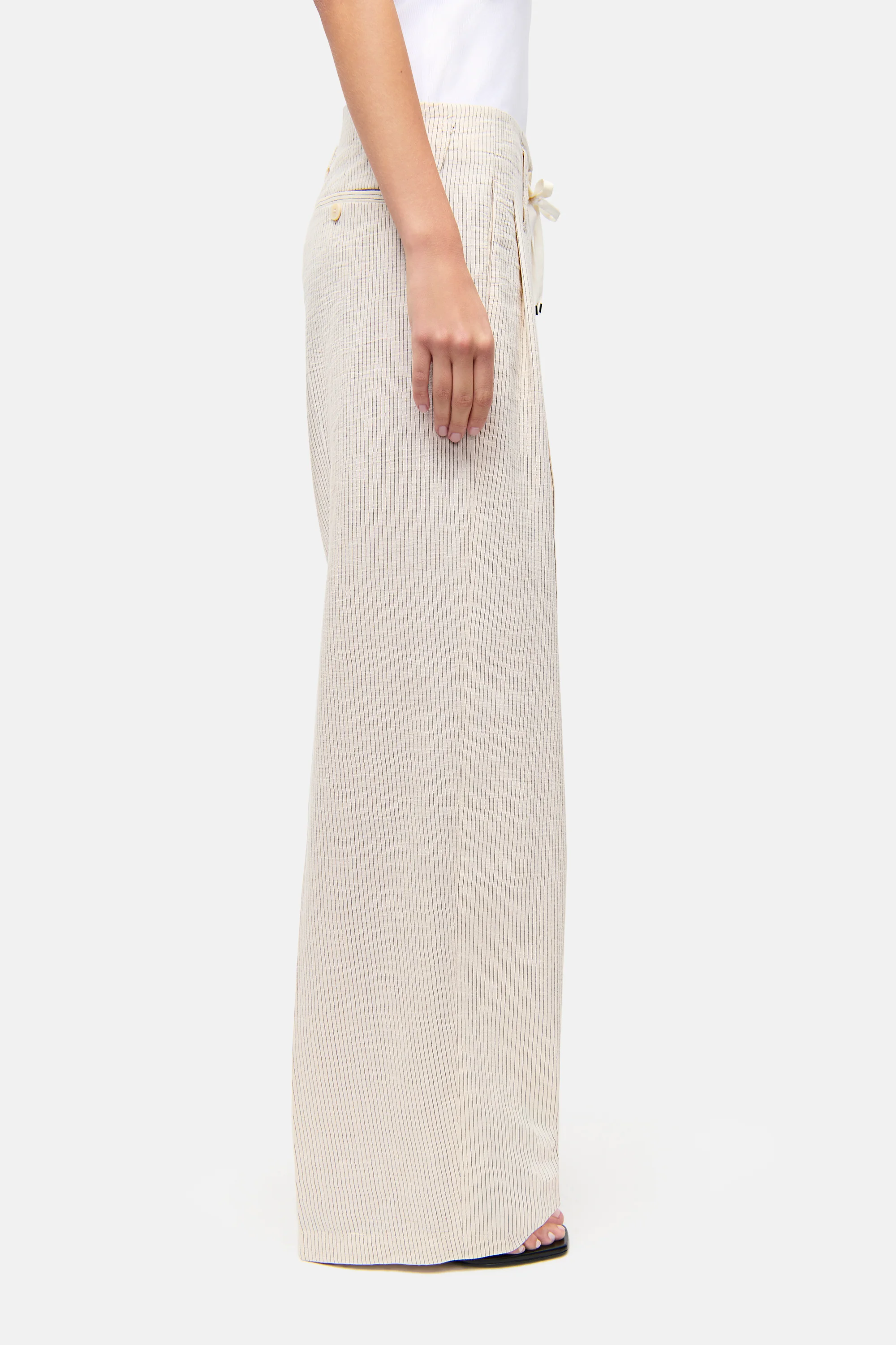 Wide Leg Hose ADDISON in Full Length. Die Hose überzeugt mit ihrem weit geschnittenen Bein und dem hochwertigen Baumwoll-Leinen-Mix, der besonders angenehm zu tragen ist. Ideal für lässige Sommer-Styles, setzen die doppelte Bundfalte und die Schnürung stilvolle Akzente. Ein leichter, sommerlicher Allrounder für elegante und unkomplizierte Looks. Erhältlich in Weiß und Gestreift.