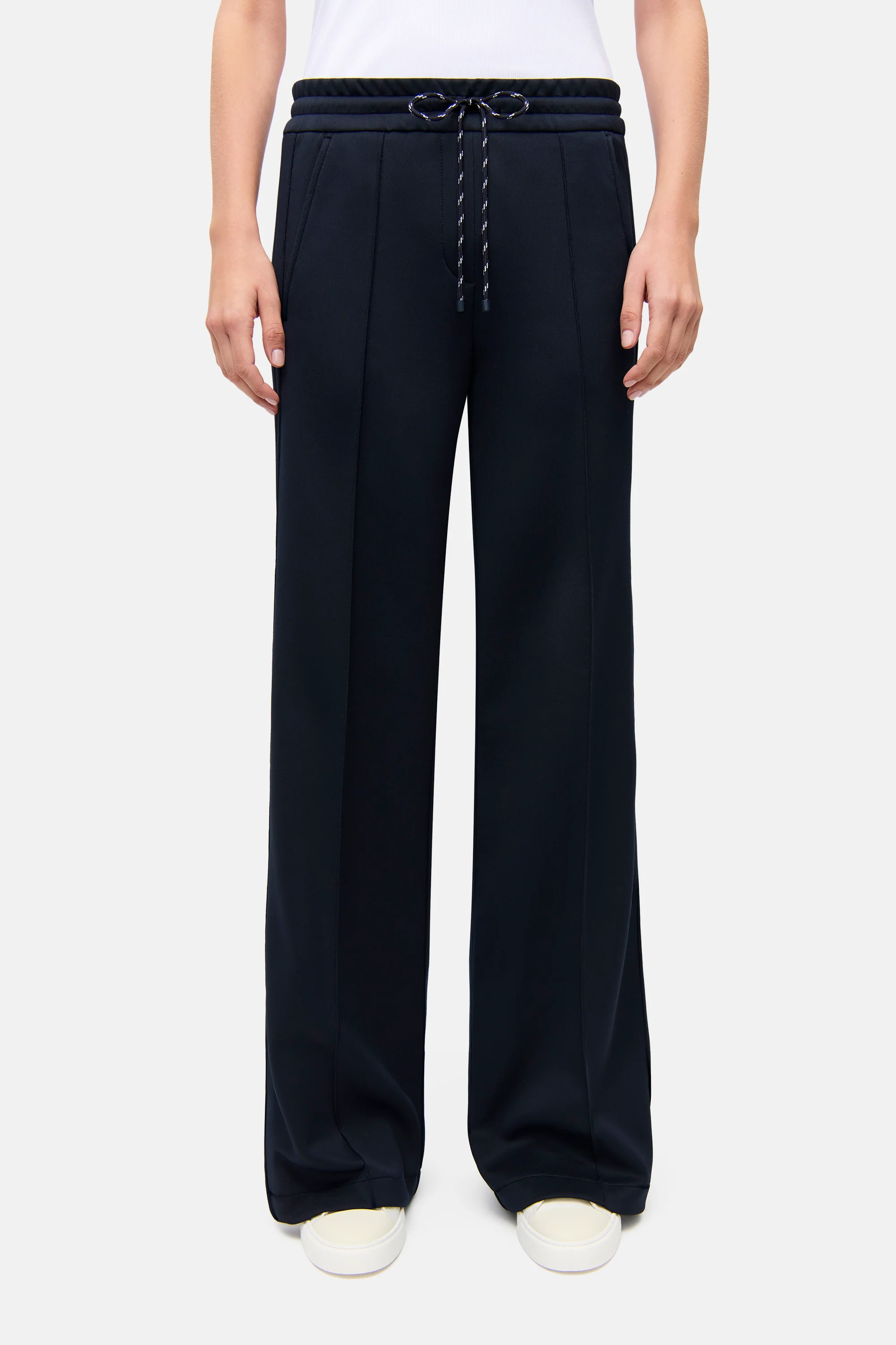 Wide Leg Hose AMELIA in Full Length in Navy. Die Hose überzeugt mit einer modernen Wide-Leg-Silhouette und einem lässigen, fließenden Fall – perfekt für einen stilvollen Athleisure- oder Loungewear-Look. Auffälliger Kordelzug und seitliche Galonstreifen, die sich mit einem Reißverschluss öffnen lassen, verleihen dem Modell einen modernen Twist. Der hochwertige Neopren-Jersey ist besonders elastisch, knitterarm und pflegeleicht, während der dezente Lüster die Navy-Farbe elegant zur Geltung bringt. Komfort trifft hier auf modisches Statement.