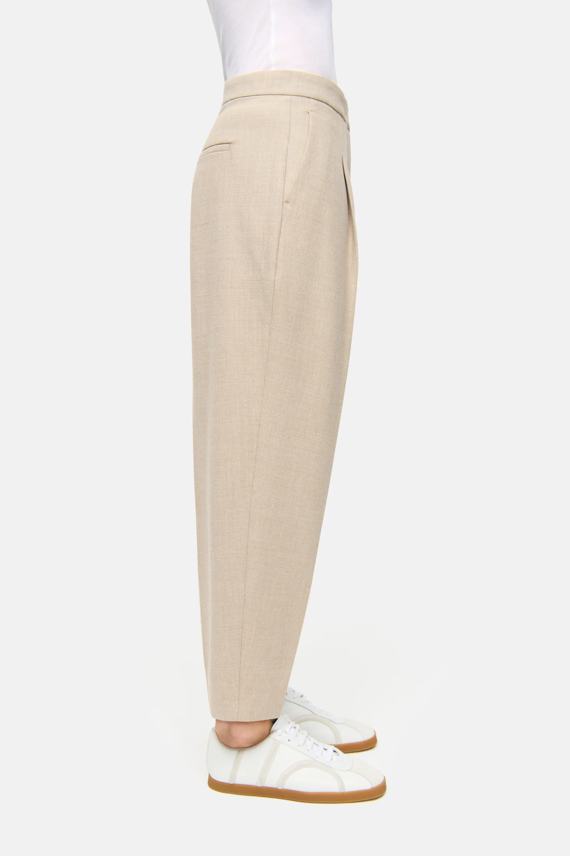 O-Shape Hose ELAINE in verkürzter Länge. Die Hose in Beige aus hochwertigem Wool Substitute überzeugt mit einem weichen Griff und verbindet sportliche Eleganz mit angenehmem Tragekomfort. Die Bundfalte und der integrierte Gürtel setzen stilvolle Akzente. Die voluminöse Rundung umspielt die Figur, während die schmal zulaufende, verkürzte Form eine harmonische Balance zwischen Weite und Definition schafft. Erhältlich in Beige und Pinstripe Navy.