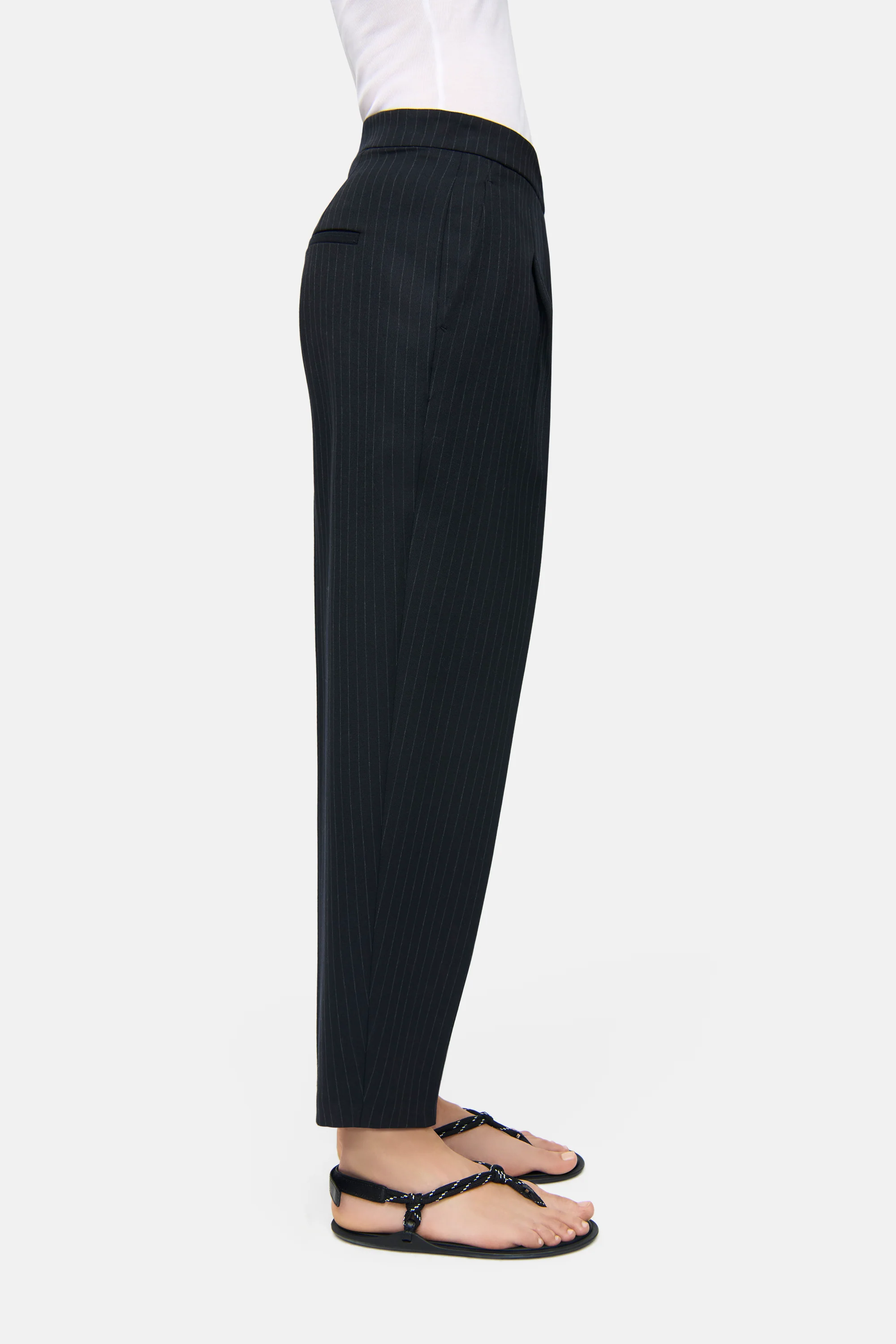 O-Shape Hose ELAINE in verkürzter Länge. Die Hose in Pinstripe Navy aus hochwertigem Wool Substitute überzeugt mit einem weichen Griff und verbindet sportliche Eleganz mit angenehmem Tragekomfort. Bundfalte und integrierter Gürtel setzen stilvolle Akzente und unterstreichen das feine Nadelstreifenmuster. Die voluminöse Rundung umspielt die Figur, während die schmal zulaufende, verkürzte Form eine harmonische Balance zwischen Weite und Definition schafft. Erhältlich in Beige und Pinstripe Navy.