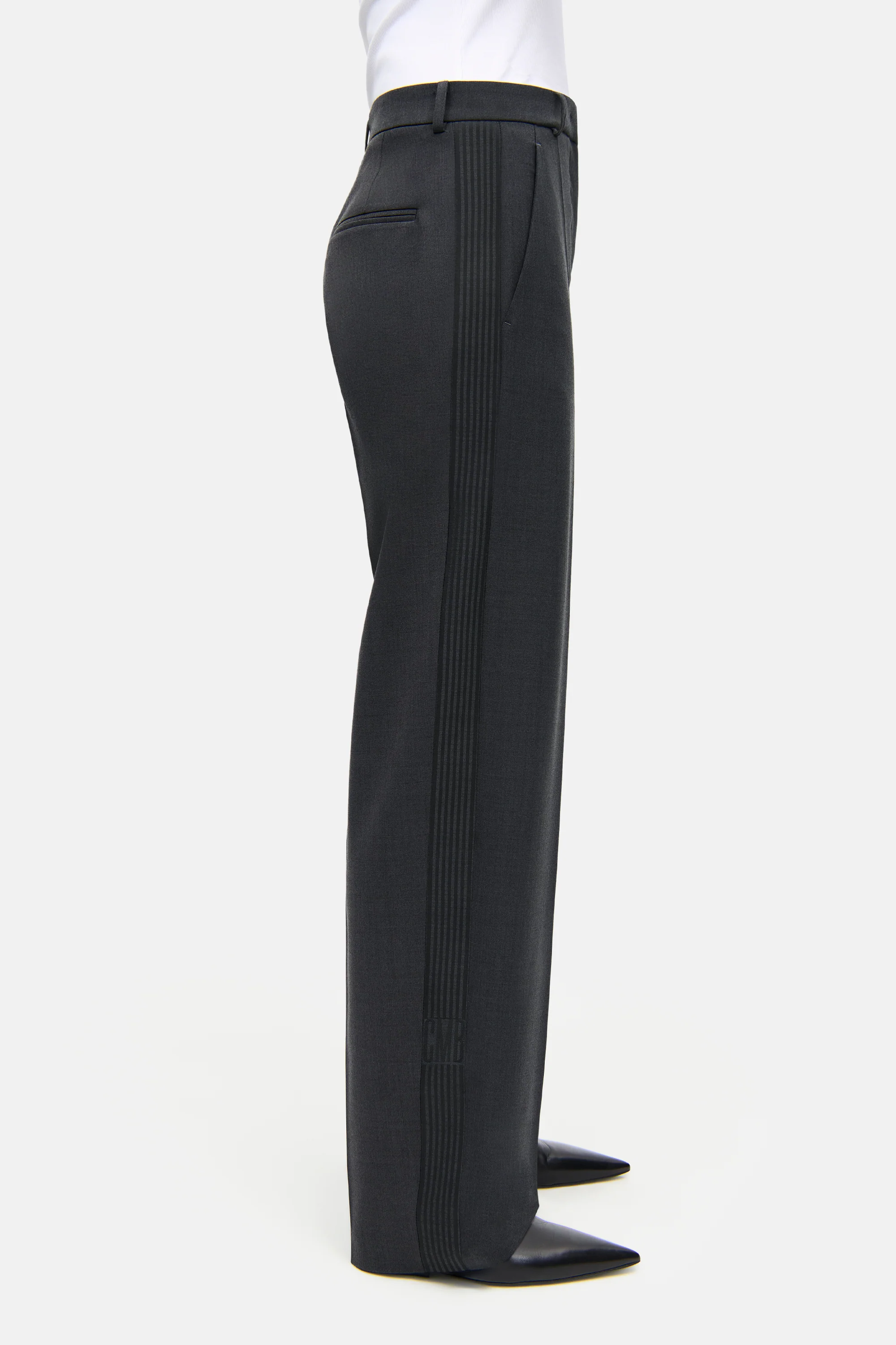 GLAM SLOUCH TRACK Hose in Karotten-Form und Full Length. Die Hose präsentiert sich in einer modernen, leicht konischen Silhouette mit schmal zulaufendem Bein in voller Länge – eine spannende Form, die Komfort und Stil gekonnt vereint. Der edle Wool-Melange-Stoff mit weicher Haptik verleiht der Hose einen hochwertigen, strukturierten Look. Seitliche Eingrifftaschen und präzise gesetzte Bügelfalten unterstreichen den anspruchsvollen Charakter, während der seitliche Galon mit schwarzem Streifen und eingearbeitetem CMB Logo ein sportliches Statement setzt.
