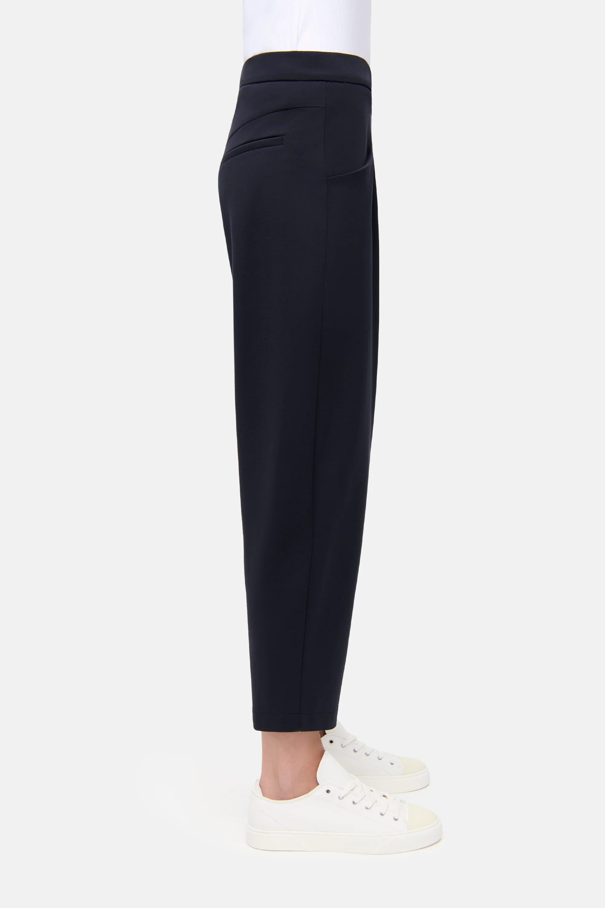 O-Shape Hose ORCHID in verkürzter Länge. Die Hose überzeugt mit einer modernen O-Shape-Silhouette – die voluminöse Rundung umspielt die Figur, während die schmal zulaufende, cropped Form eine ausgewogene Balance zwischen Weite und Definition schafft. Das tiefe Navy verleiht dem Modell eine klare, vielseitige Ausstrahlung, während große, schräg aufgesetzte Taschen für einen lässigen, urbanen Look sorgen. Die fließend gestrickte Punto-Milano-Qualität bietet hohen Komfort, optimale Elastizität und zuverlässige Form- und Farbstabilität. Der elastische Bund rundet den entspannten Charakter ab und macht die Hose zum idealen Begleiter für moderne, athleisure-inspirierte Outfits.