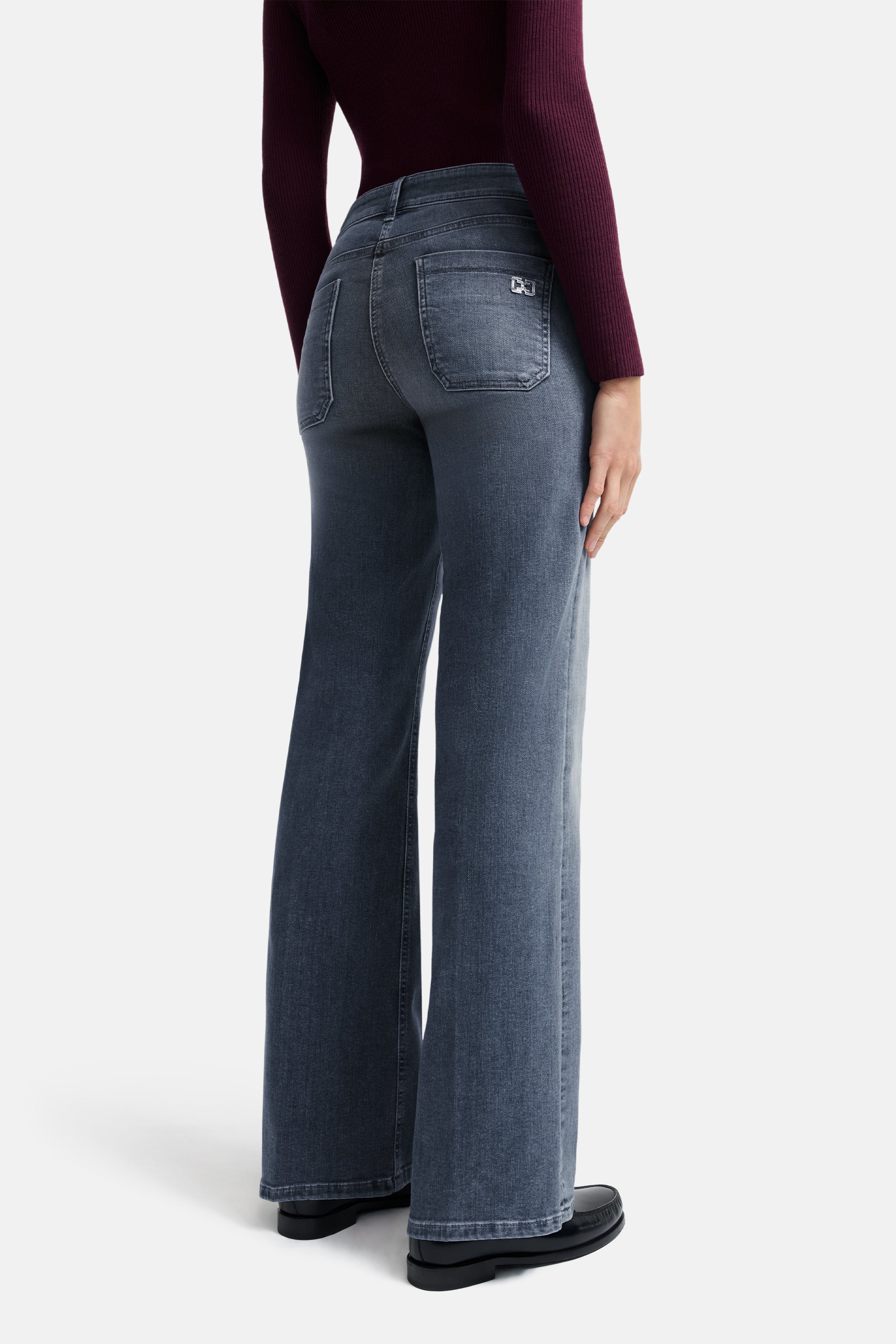 Wide Leg Denim TESS WIDE LEG in Full Length. Die graue Denim schafft durch ihren Powerstretch Komfort, den perfekten Sitz und ein weites fließendes Bein. Eyecatcher sind das goldene Logo am Backpocket und die aufgesetzten Vordertaschen.